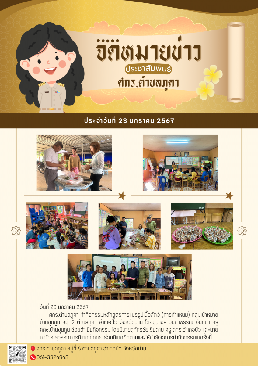 ศกร.ตำบลภูคา ทำกิจกรรมหลักสูตรการแปรรูปเนื้อสัตว์ (การทำแหนม) กลุ่มเป้าหมายบ้านแจลง หมู่ที่8 ตำบลภูคา อำเภอปัว จังหวัดน่าน โดยมีนางจุฑารัตน์ ศิวะศิลป์ประศาสน์ ครู ศศช.บ้านแจลง ช่วยดำเนินกิจกรรมในครั้